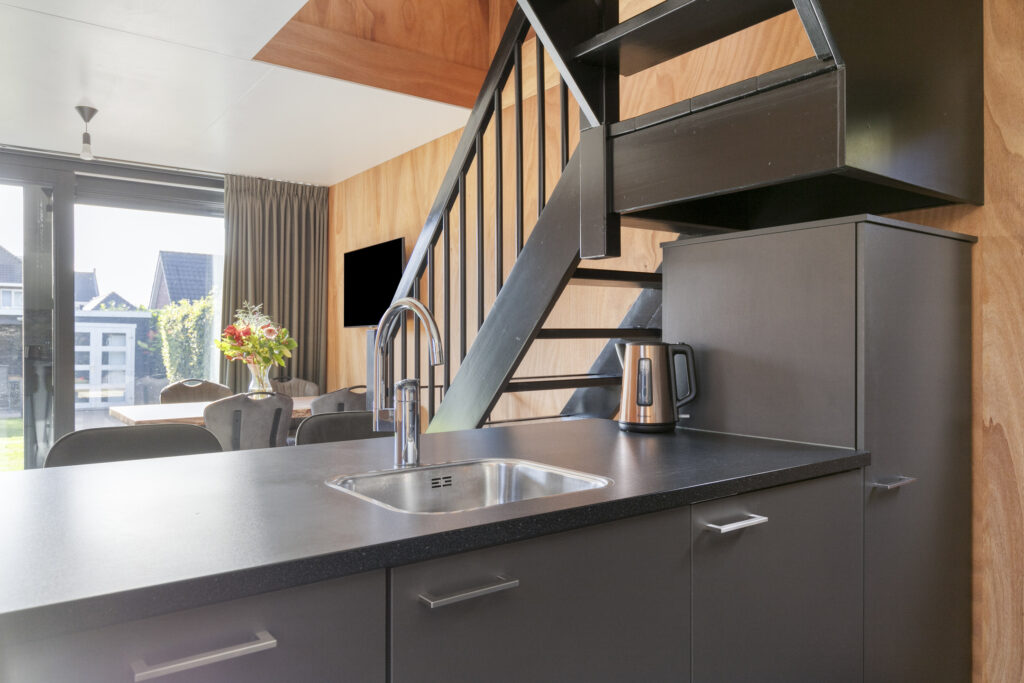 Begane grond: Entree aan de zijkant van de woning. Badkamer voorzien van toilet, wastafel en douche. Open keuken voorzien van koelkast met vriesvak, combioven, vaatwasser, inductiekookplaat, afzuigkap en wasaansluiting. Zithoek met schuifpui naar de tuin en trapopgang naar de eerste verdieping. Meterkast bereikbaar via buiten.