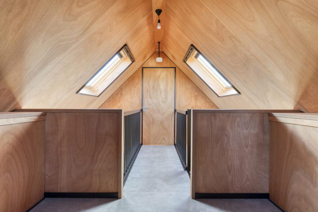 Eerste verdieping: overloop met vide, slaapkamer en praktische ruimte met ingebouwde kasten.
