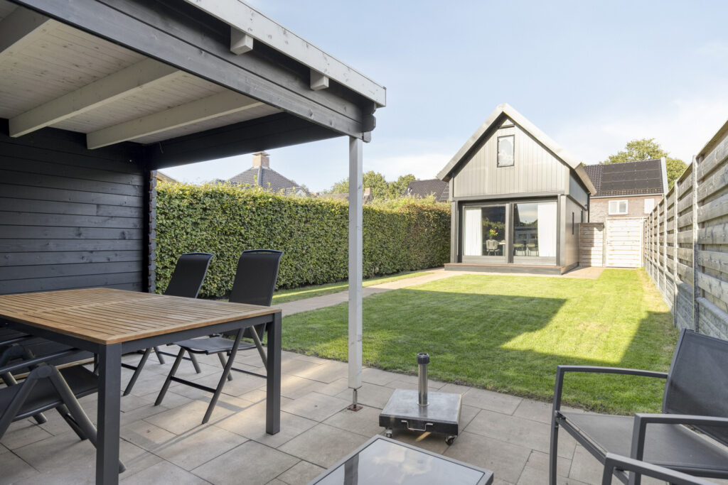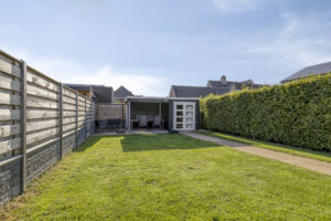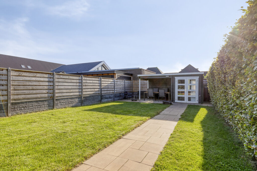 Tuin: eigen parkeerplaats aan de voorzijde, nette achtertuin bereikbaar via poort en voorzien van houten tuinhuis met overkapping.