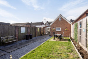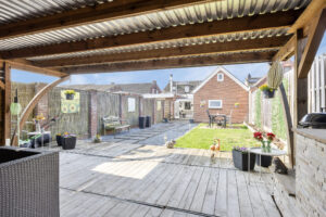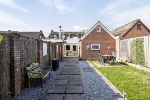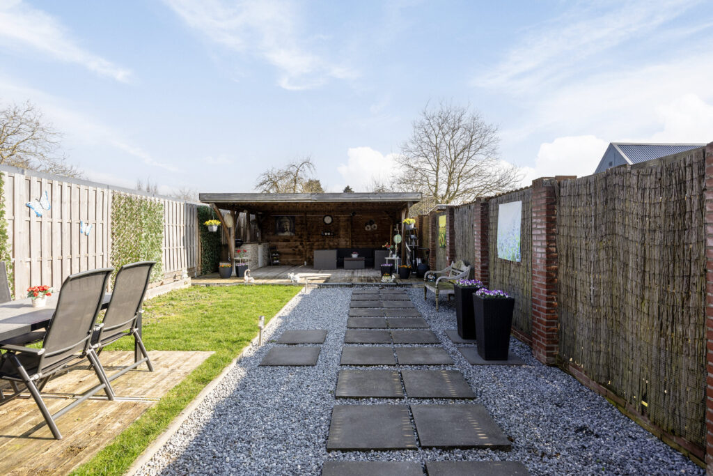 De achtertuin is verzorgd aangelegd en beschikt over een ruime overkapping waar je heerlijk beschut kunt zitten. Daarnaast is er een praktische berging aanwezig die van buitenaf bereikbaar is. Een fijne plek om te ontspannen of gezellig buiten te eten.