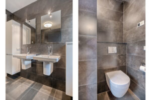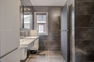 – Badkamer met dubbele wastafel, toilet en inloopdouche