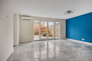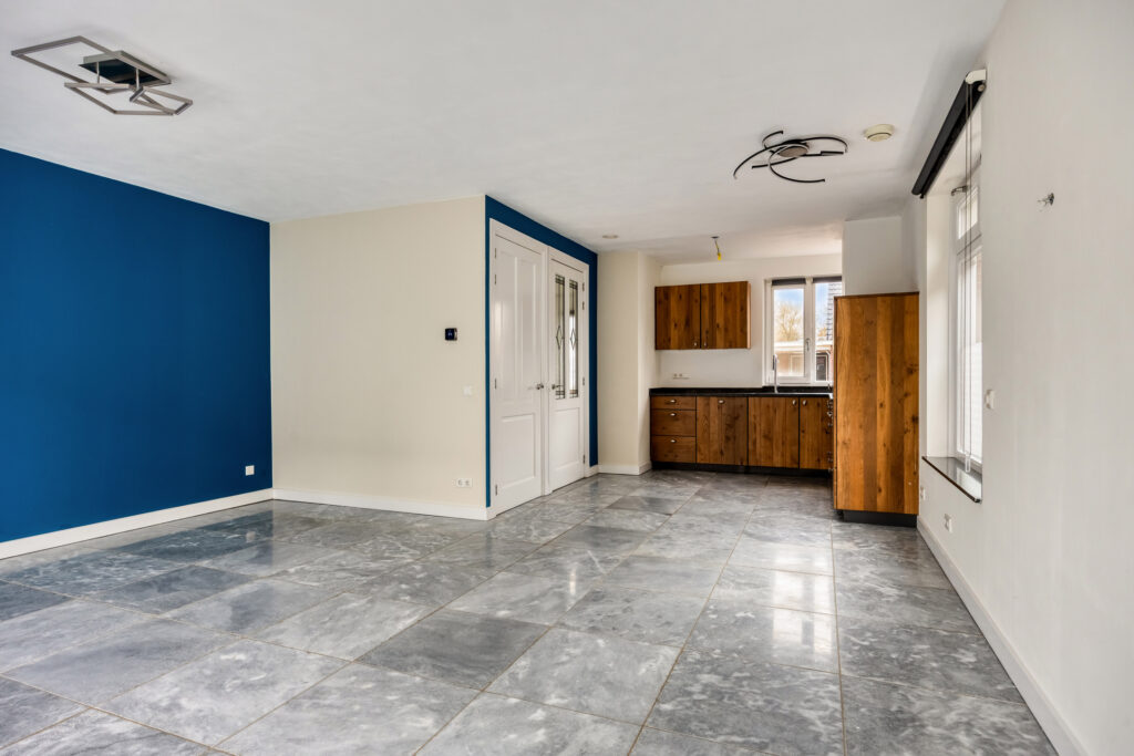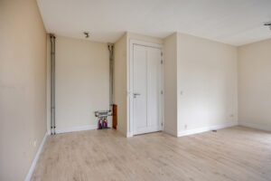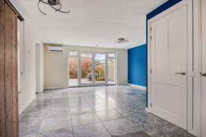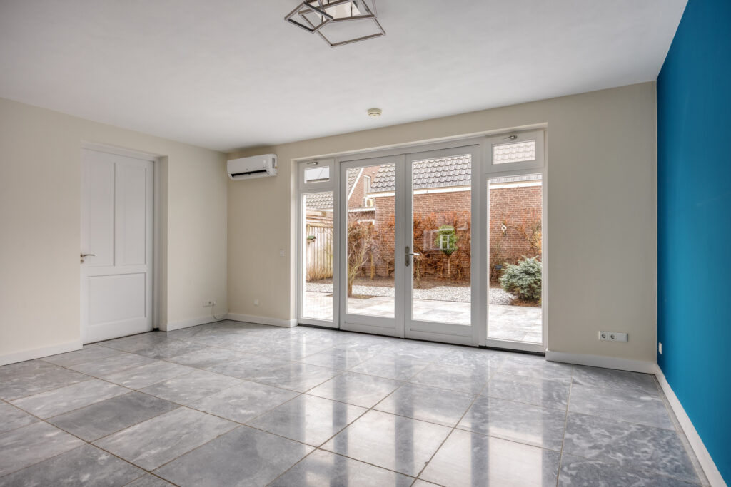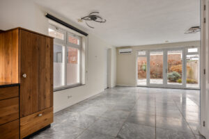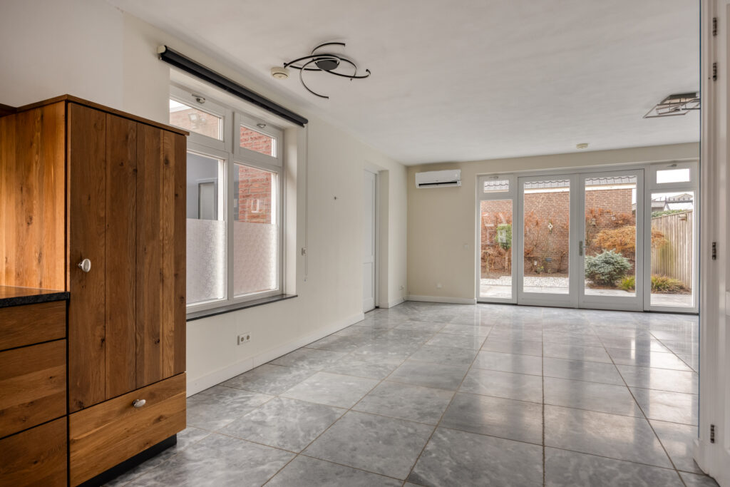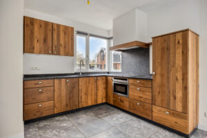 Entree met hal, meterkast en toiletruimte. De woonkamer is tuingericht en geniet van veel lichtinval. Dankzij de vloerverwarming en airco is het hier het hele jaar door comfortabel. De open keuken aan de voorzijde is uitgevoerd in massief eiken en is voorzien van koelkast, combi-oven, vaatwasser, inductiekookplaat en afzuigkap.