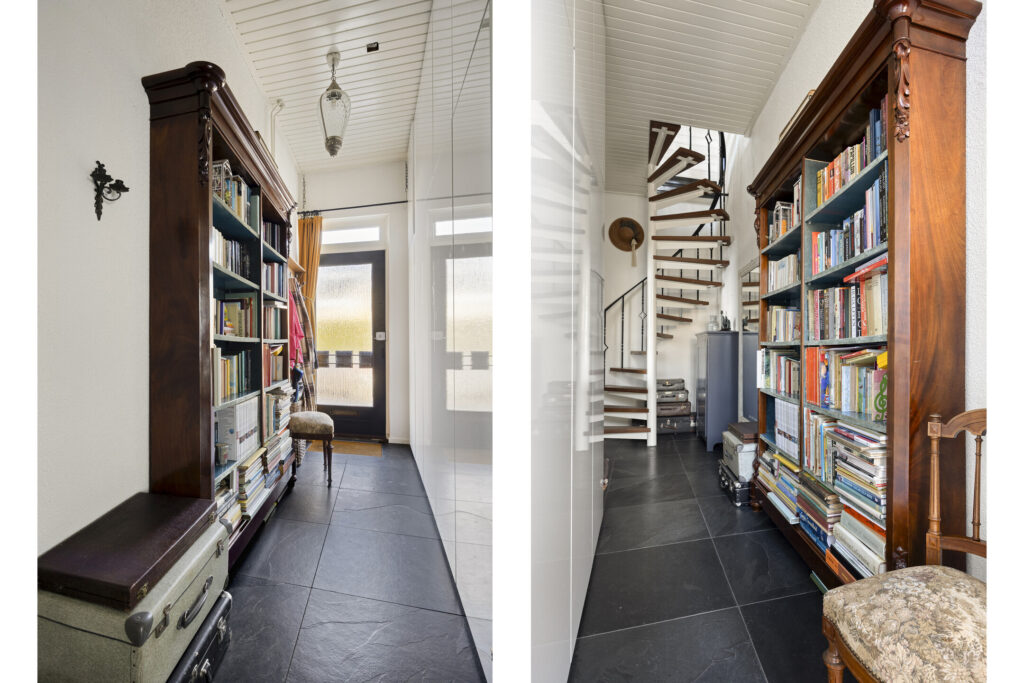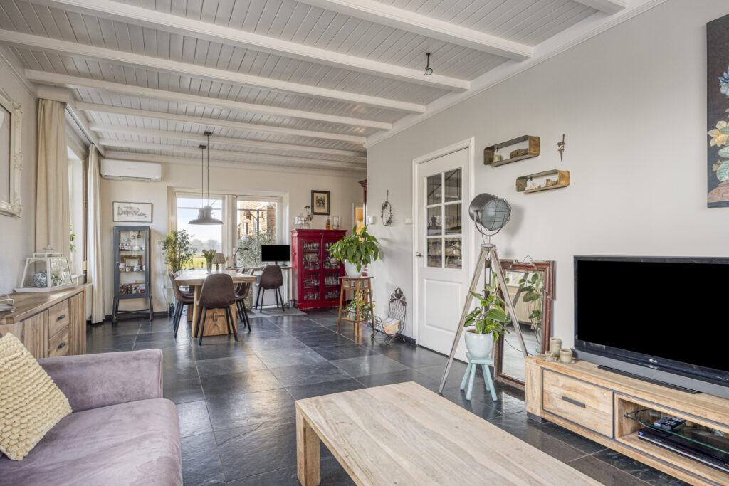 Begane grond: Binnenkomst via de hal met toegang tot de ruime woonkamer. De open eetkamer staat in verbinding met de keuken, die is uitgerust met een oven-magnetron, gasfornuis, afzuigkap, vaatwasser en koelkast. In de aanbouw bevinden zich het toilet en de bijkeuken met aansluitingen voor witgoed. Boven de bijkeuken bevindt zich een extra (slaap)kamer met dakkapel, een tweede douche en wastafel – ideaal als extra badkamer, hobbyruimte of logeerkamer.