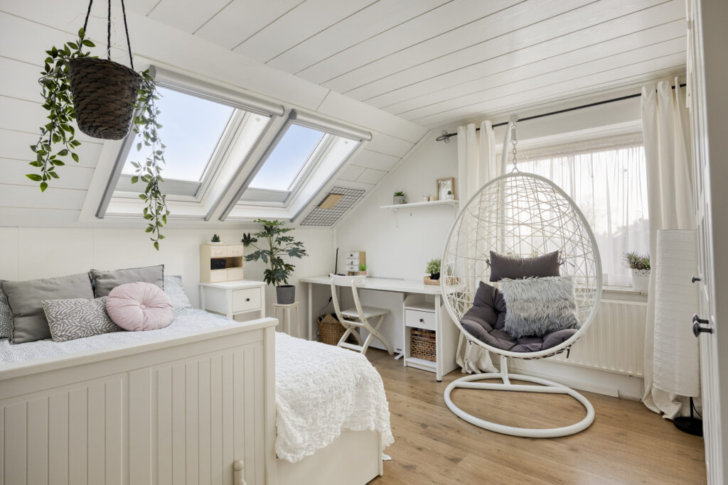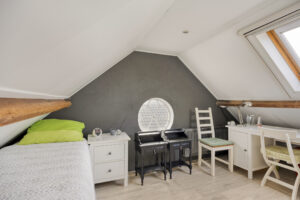Ruime zolderverdieping met een slaapkamer en extra bergruimte. Deze ruimte is bereikbaar via een vaste trap en beschikt over 2 dakramen.