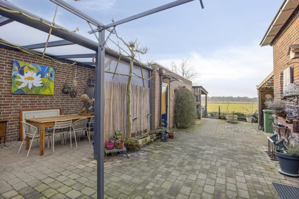 De achtertuin is speels aangelegd met diverse terrassen, beplanting en een fijn uitzicht op de landerijen. Achter in de tuin bevindt zich een overkapping en lager gelegen gazon. De vrijstaande garage en carport bieden volop ruimte voor opslag en parkeren.