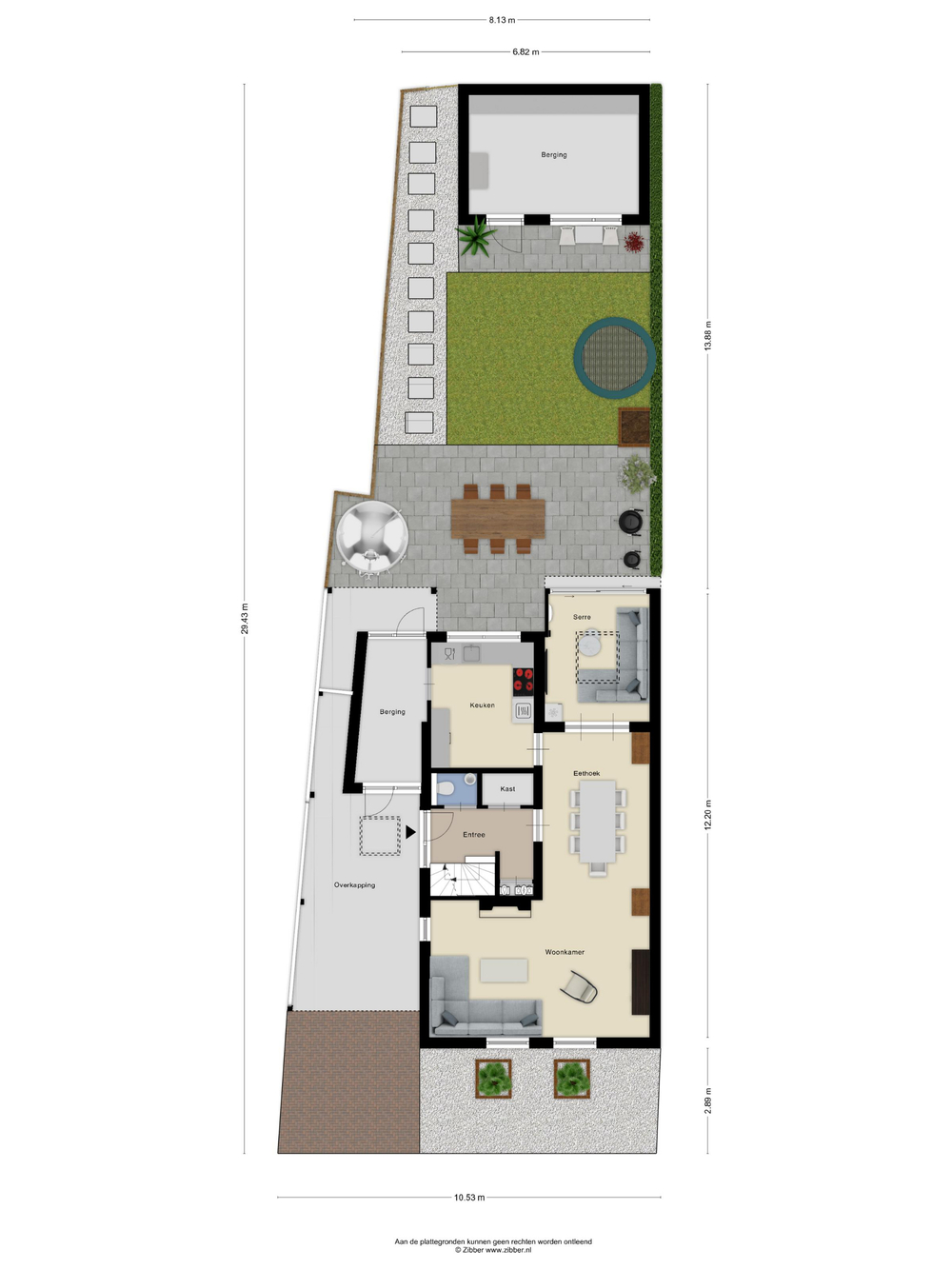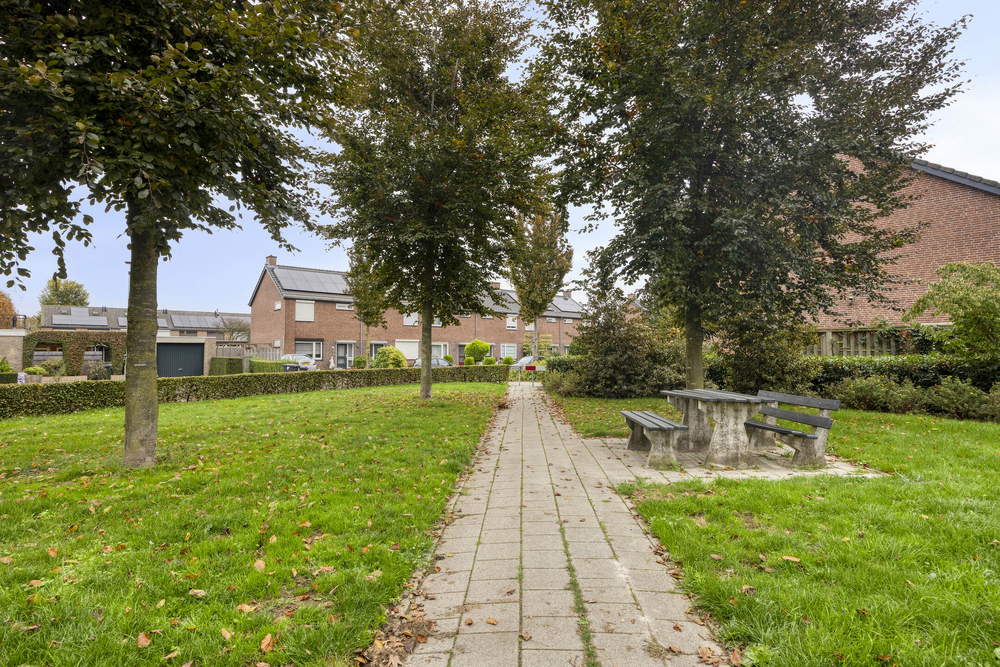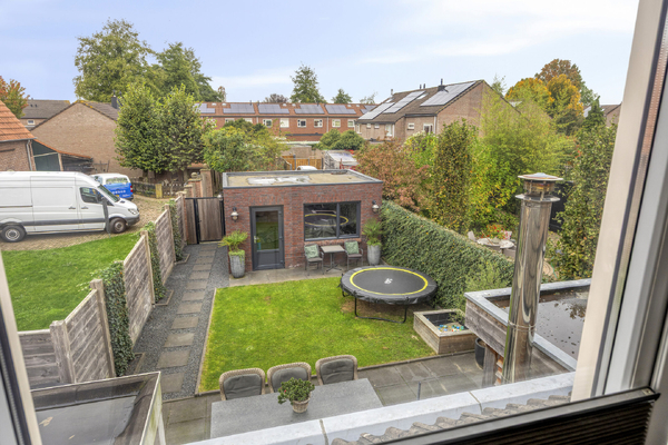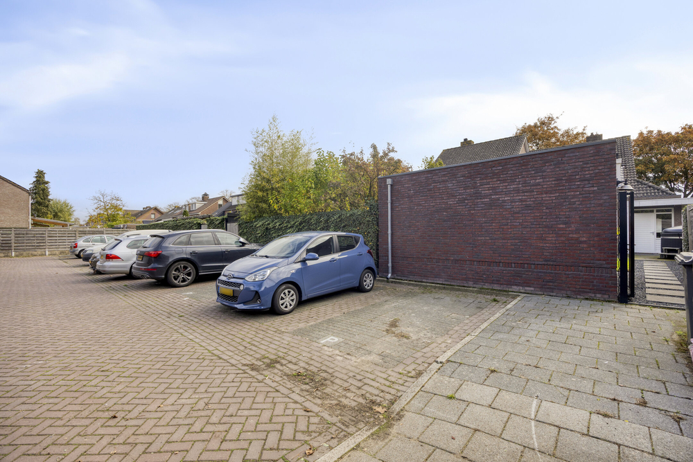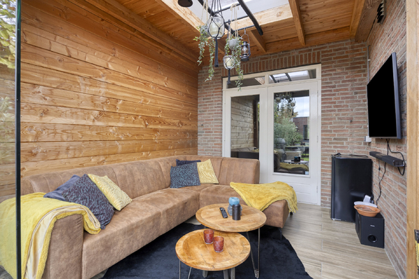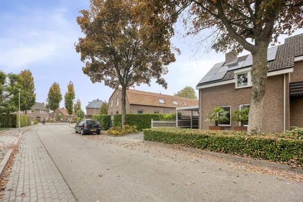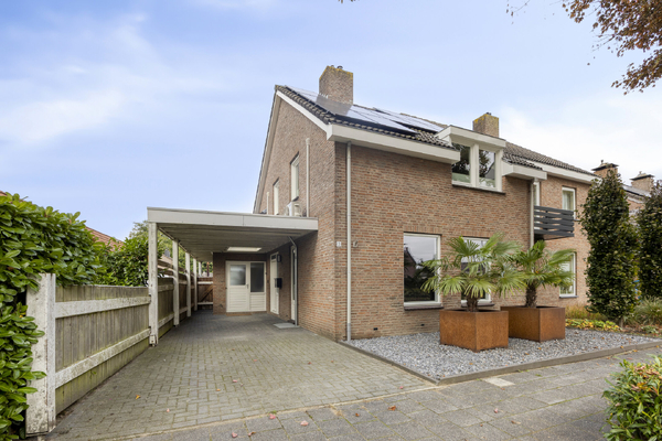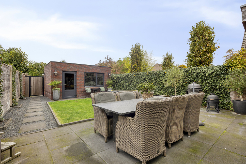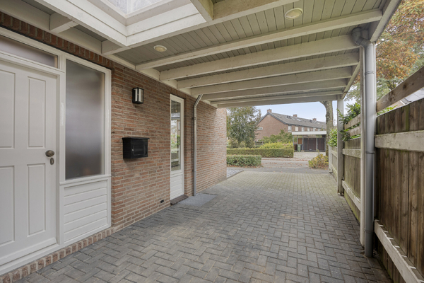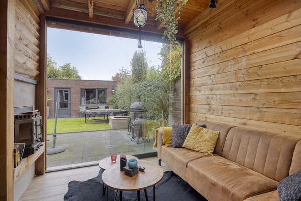 Tuin: netjes aangelegd en voorzien van nieuwe vrijstaande schuur, overkapping met glazen wand en houtkachel en bereikbaar via achterom (2x). Oprit aan de voorzijde met carport.