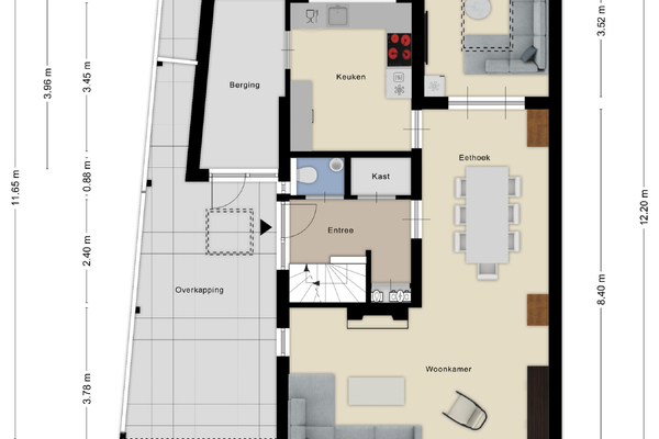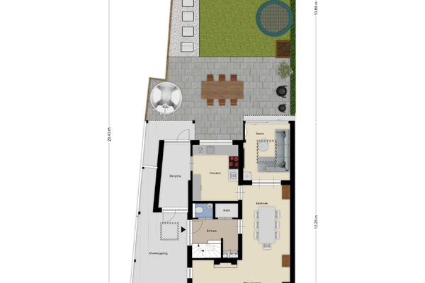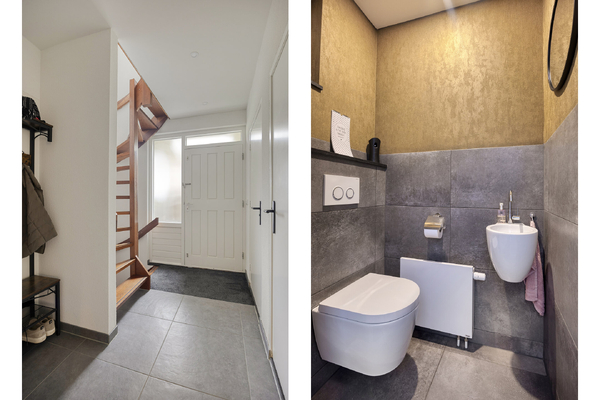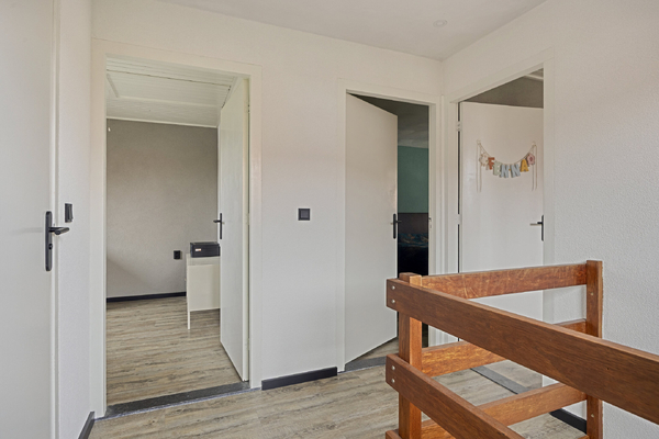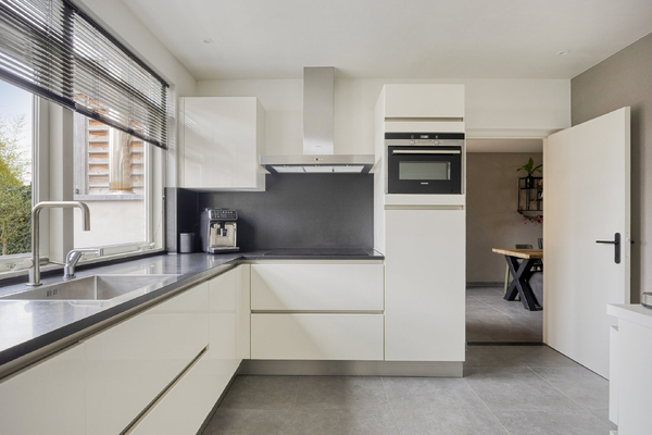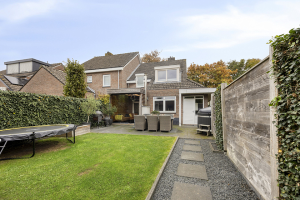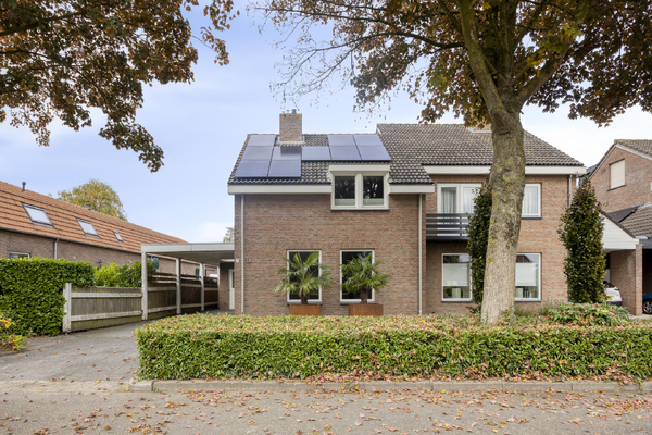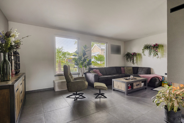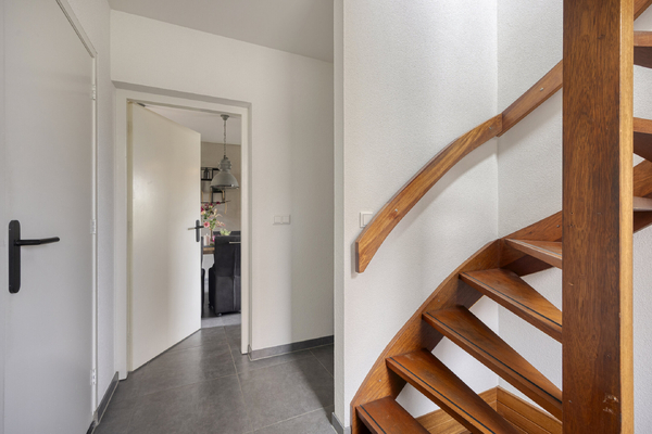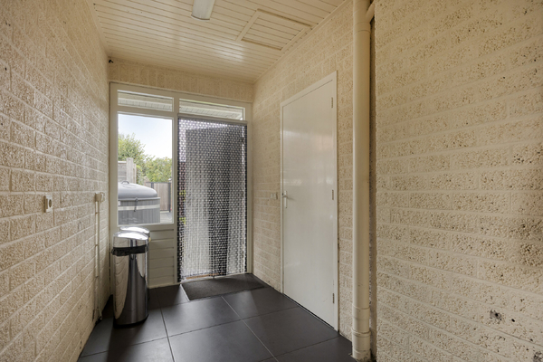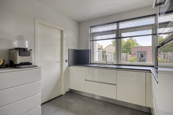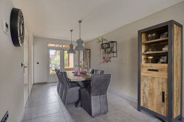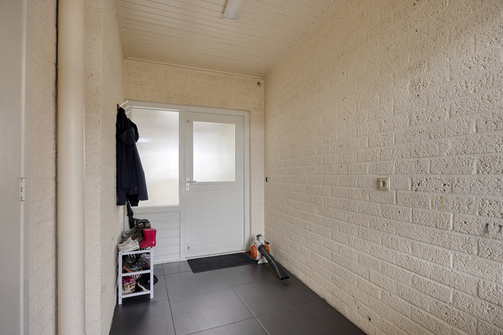 Begane grond: Hal/entree met meterkast en toilet, woonkamer met veel lichtinval en eethoek met zicht op de tuin en toegang tot de overkapping. Moderne keuken voorzien van inbouwapparatuur. Praktische achterbouw met toegang tot de oprit met carport of de achtertuin.