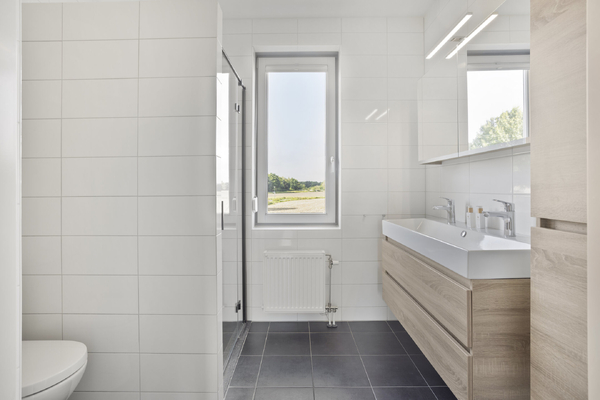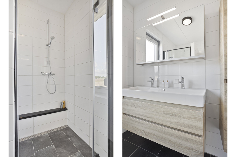 Eerste verdieping: Overloop met toegang tot drie slaapkamers. De moderne badkamer is compleet uitgevoerd met een inloopdouche, dubbele wastafel en toilet.