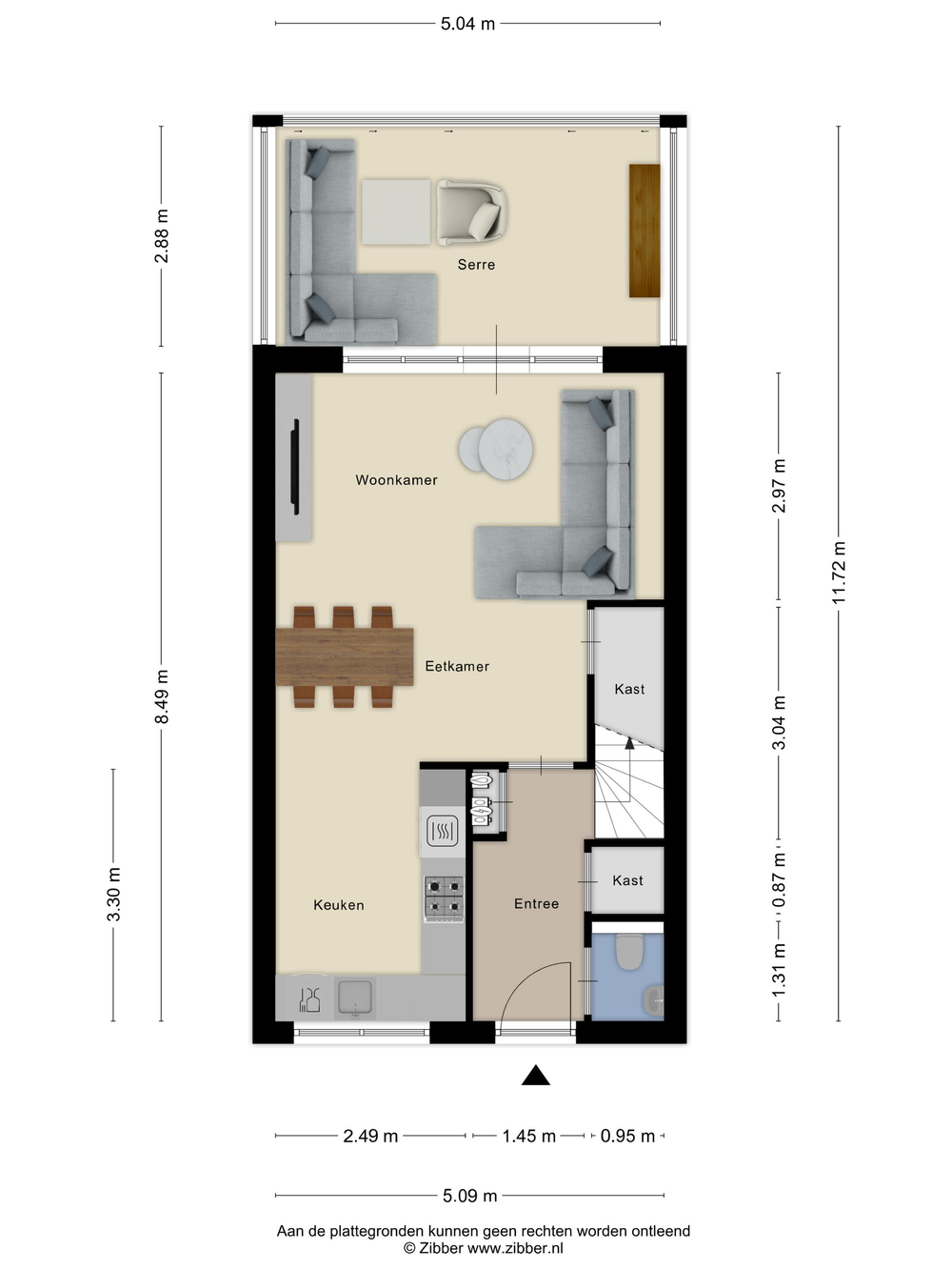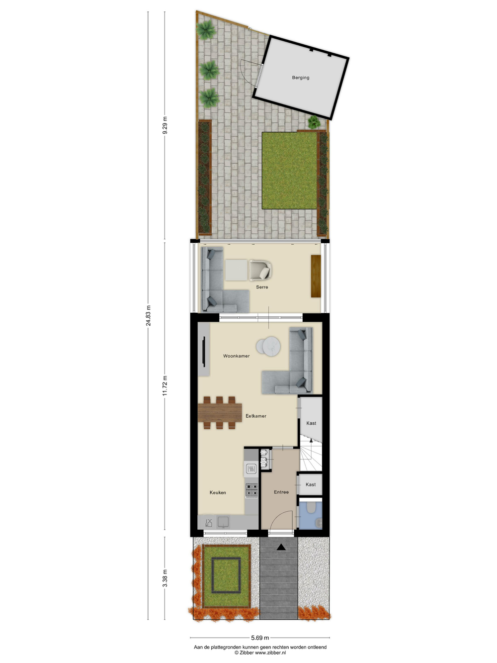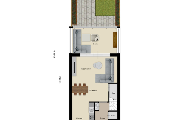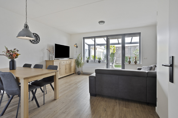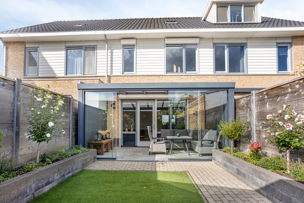 Begane grond: Je komt binnen in de hal met toilet, meterkast en praktische kast. De lichte woonkamer is tuingericht en voorzien van een trapkast. Aan de voorzijde bevindt zich de moderne open keuken met inbouwapparatuur. Aan de achterzijde is de woning uitgebouwd met een fraaie serre/overkapping met glazen schuifwanden. De tuin beschikt over een achterom en een houten berging.