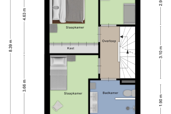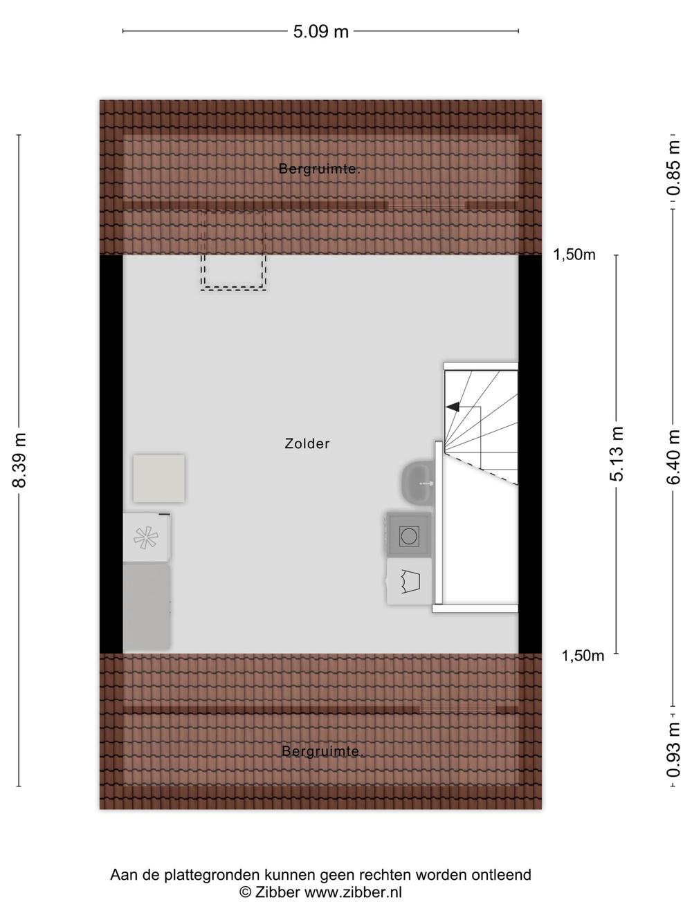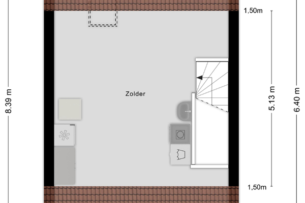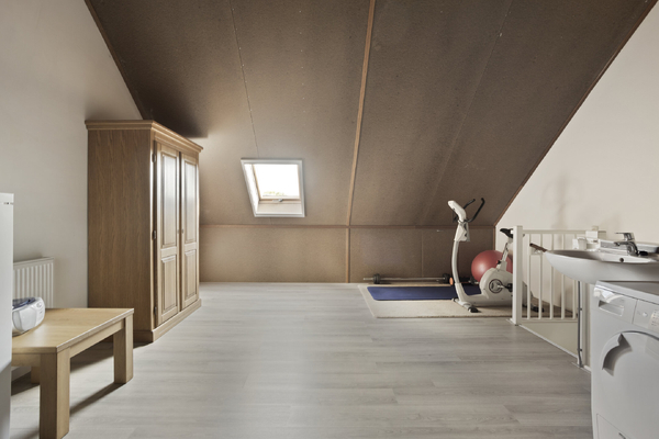 Tweede verdieping: Ruime open zolder met dakraam, wasmachineaansluiting en wastafel. Deze verdieping biedt volop mogelijkheden voor een extra slaapkamer, werkruimte of hobbyruimte.