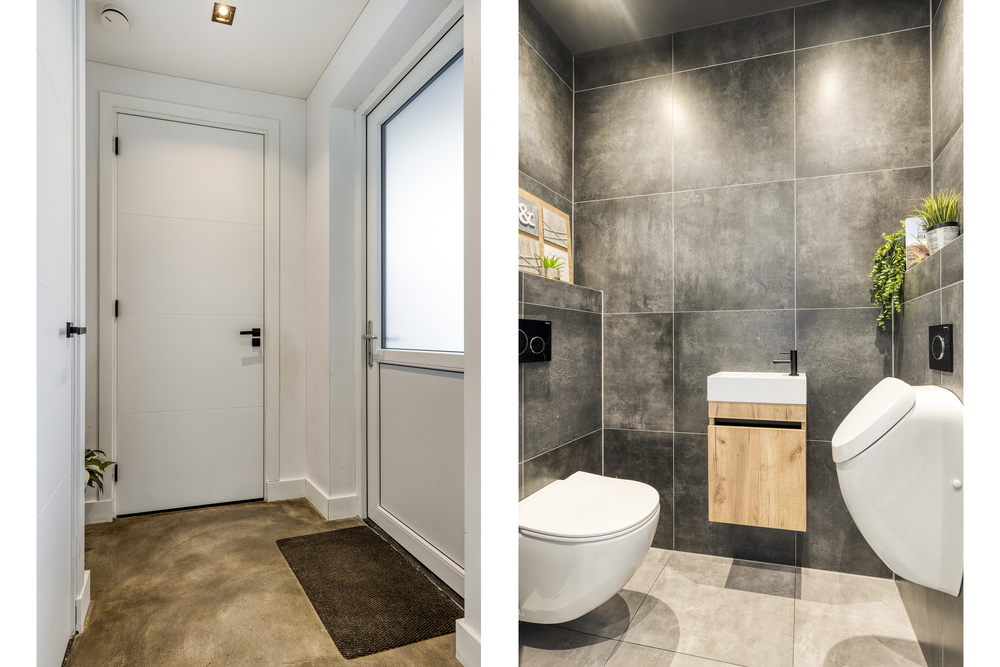 Entree en trapopgang. Vanuit de hal is er toegang tot de royale leefkeuken. De woonkamer is licht en ruim opgezet en staat in directe verbinding met de tuin. De leefkeuken is voorzien van een koelkast, combi-oven, vaatwasser, inductieplaat, afzuigkap en quooker. De keuken biedt volop ruimte voor een grote eettafel en vormt het hart van de woning. Daarnaast beschikt de begane grond over een extra kamer, ideaal als werk-, speel- of hobbyruimte. Vanuit de woonkamer is er tevens toegang tot een hal met meterkast en toilet.