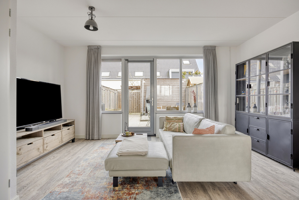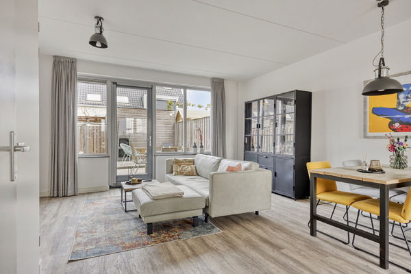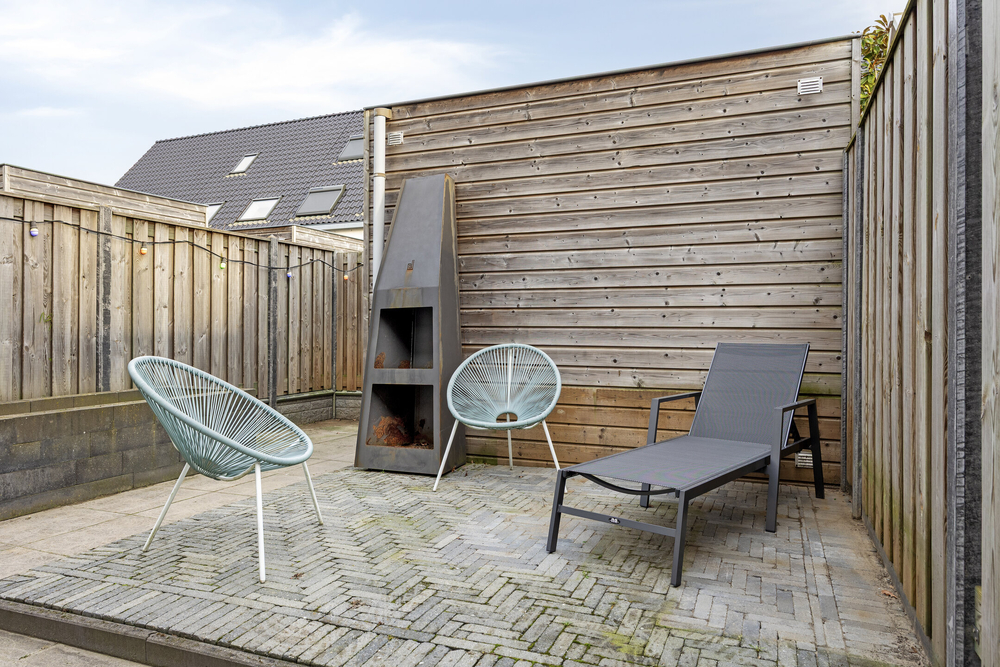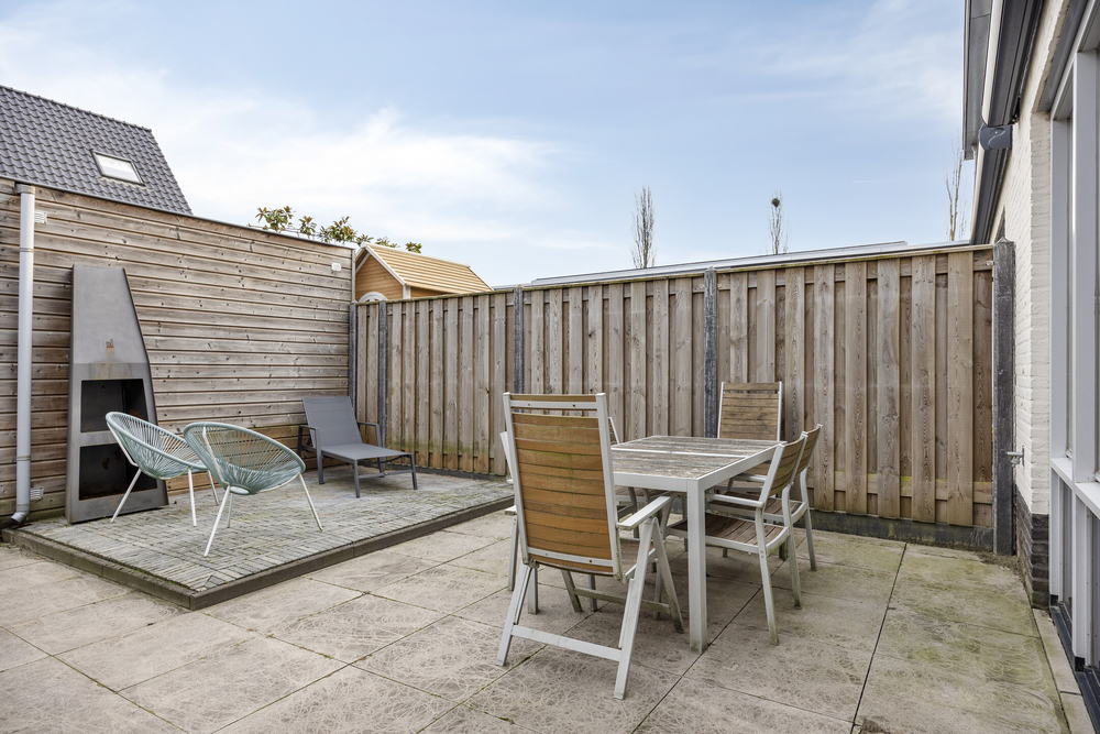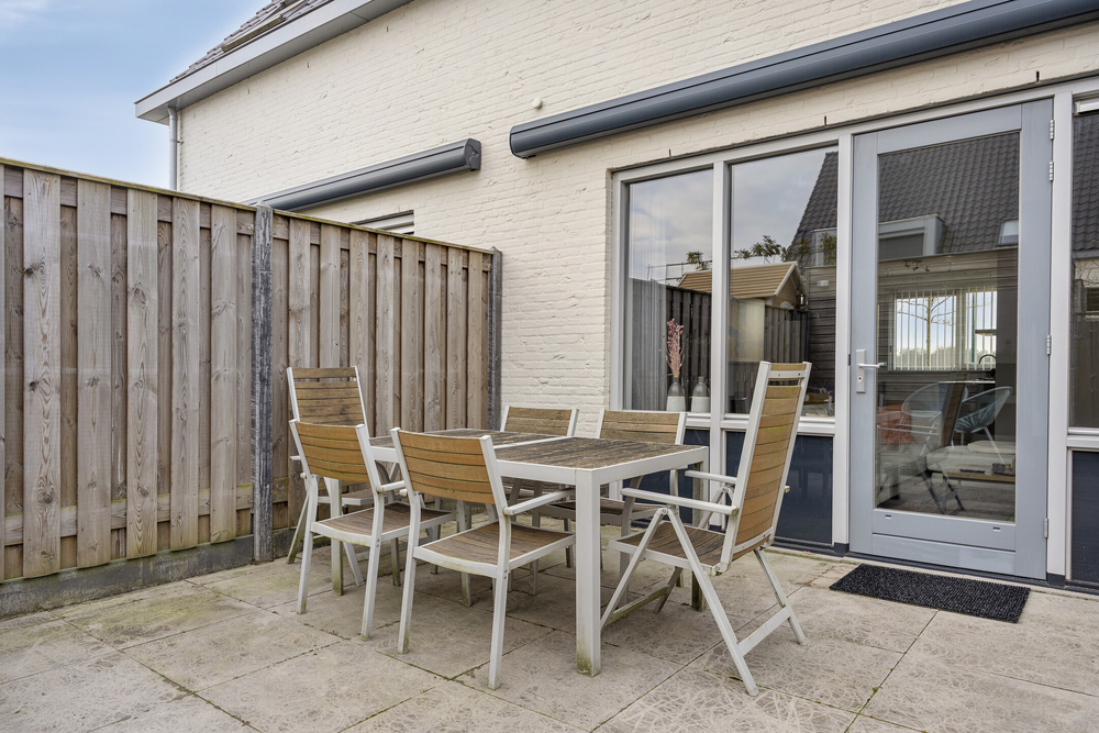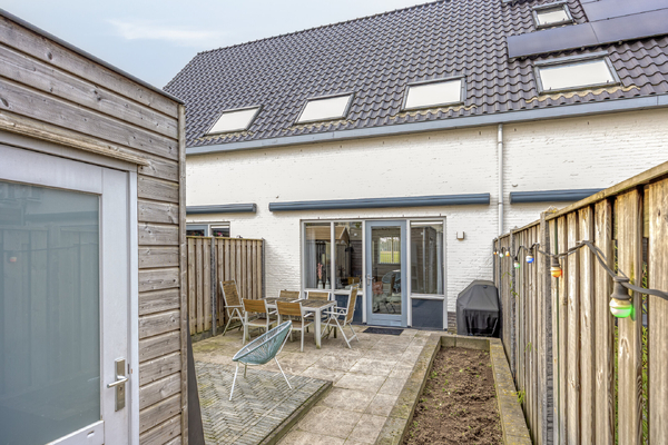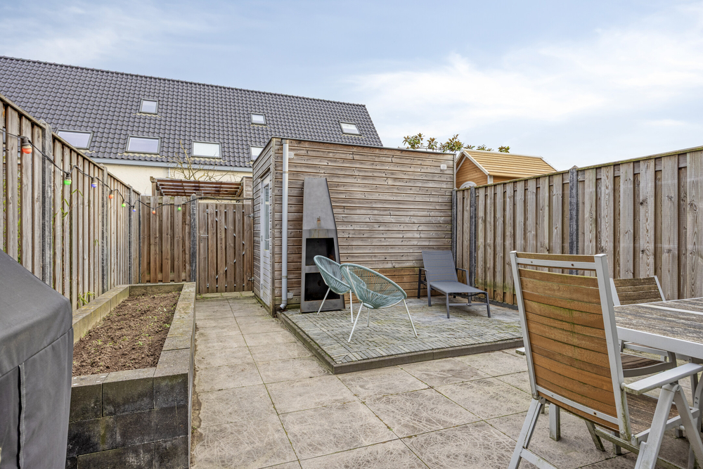 De achtertuin is onderhoudsvriendelijk aangelegd, voorzien van een terras met elektrisch zonnescherm en een buitenkraantje. Achterin staat een houten berging, ideaal voor fietsen en tuingereedschap. Via de achterom is de tuin ook gemakkelijk bereikbaar.