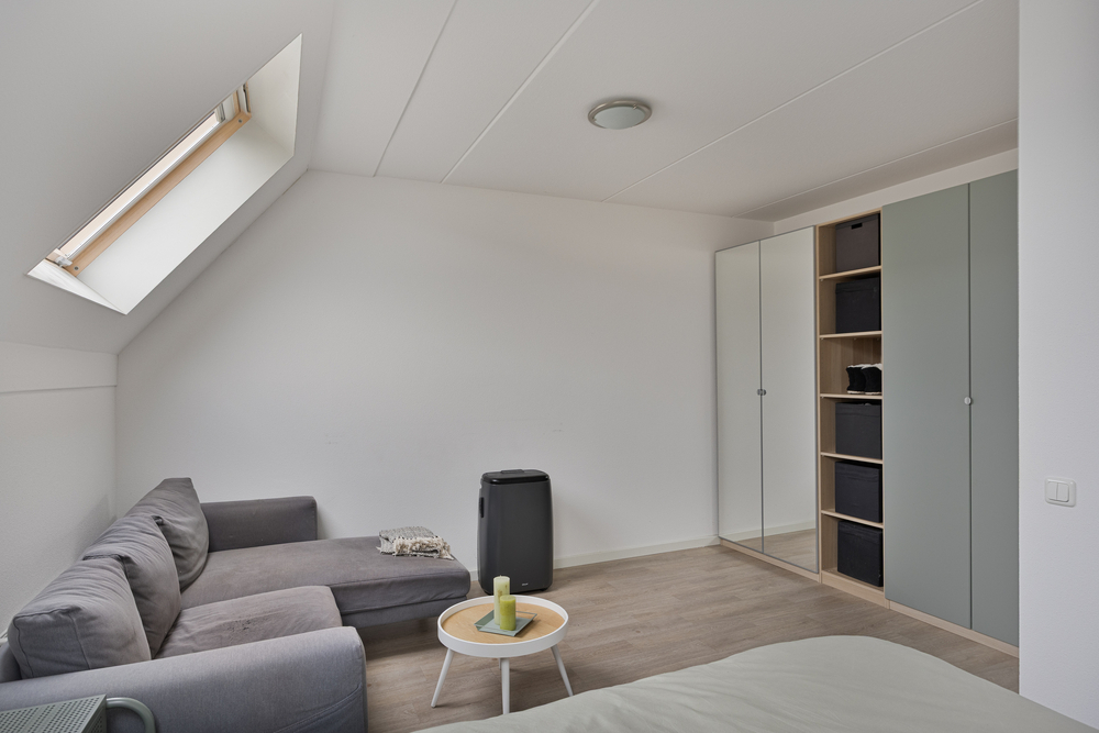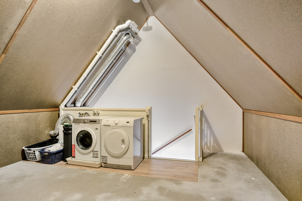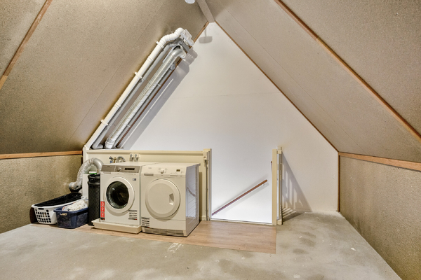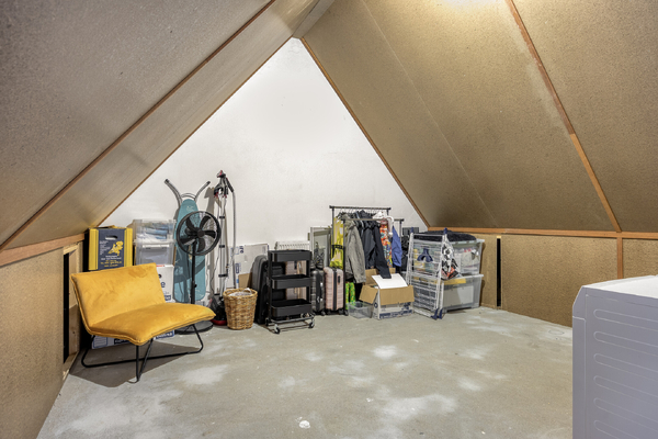 Ruime zolder bereikbaar via een vaste trap, met aansluitingen voor wasmachine en droger. Ideaal als hobbyruimte, berging of werkkamer. Tevens de mogelijkheid om een extra slaapkamer te realiseren.