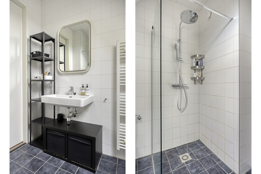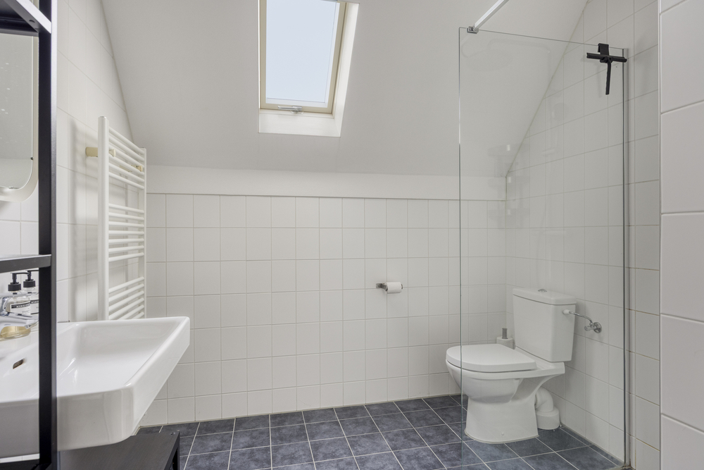 Overloop met toegang tot 2 slaapkamers, waarvan 1 ruime slaapkamer op te splitsen is in 2 slaapkamers, en de badkamer. De badkamer is uitgerust met een inloopdouche, wastafel en tweede toilet.