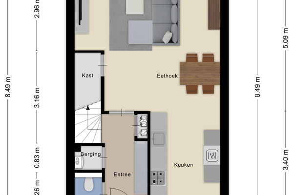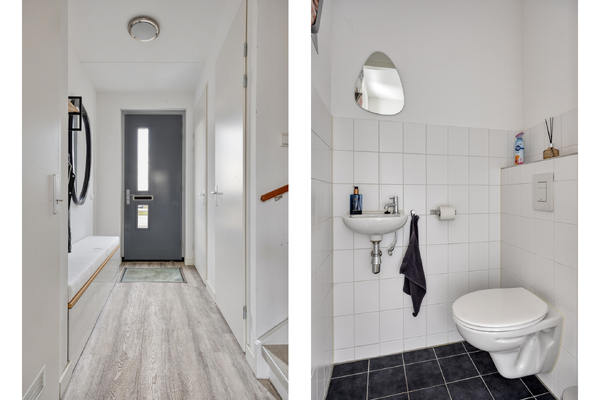 Entree/hal met meterkast, trapopgang en toiletruimte met fontein. Tuingerichte woonkamer met veel lichtinval, trapkast en deur naar het terras. Aan de voorzijde van de woning ligt de moderne open keuken, voorzien van een oven, koel-vriescombinatie, vaatwasser, gasfornuis en afzuigkap.