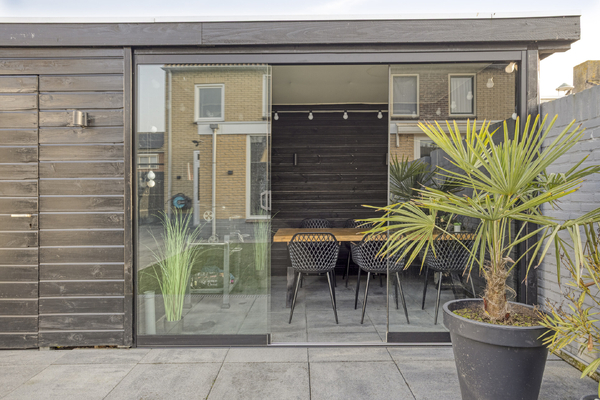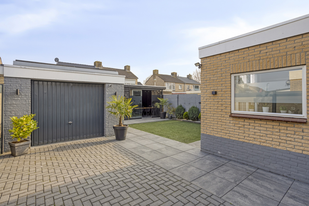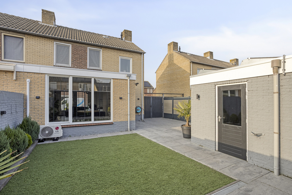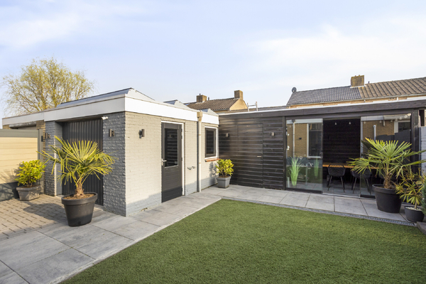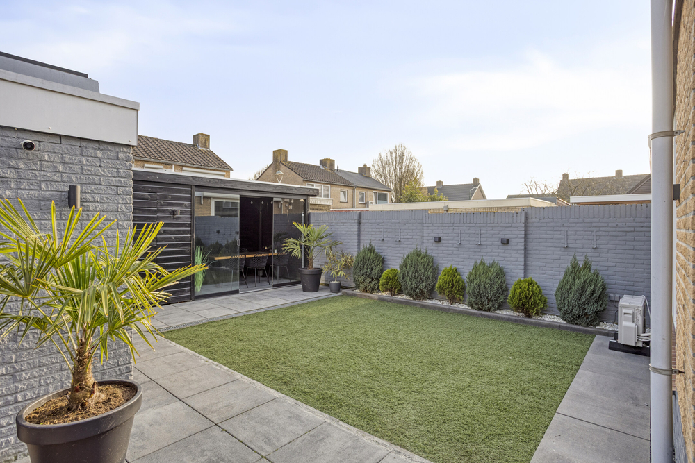 De achtertuin is netjes en onderhoudsarm aangelegd en biedt veel privacy. Achter in de tuin bevindt zich een houten overkapping met berging, een fijne plek om te ontspannen of gezellig buiten te zitten.