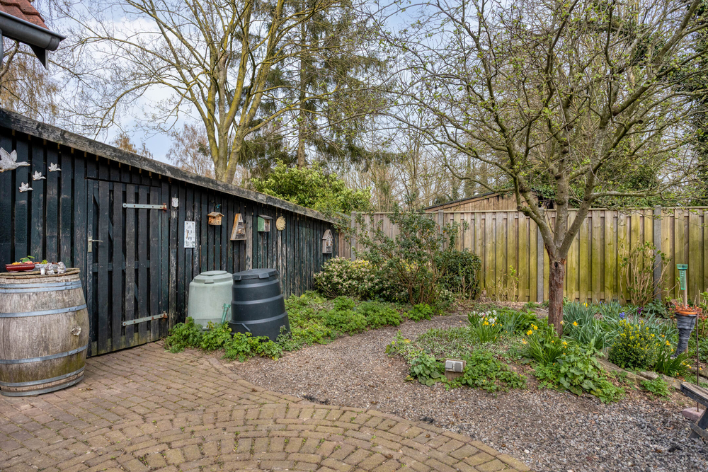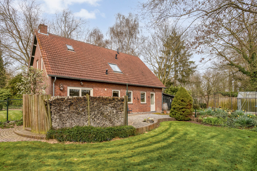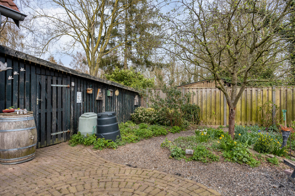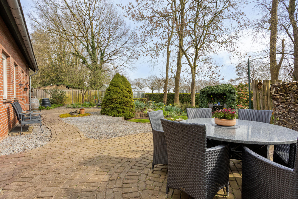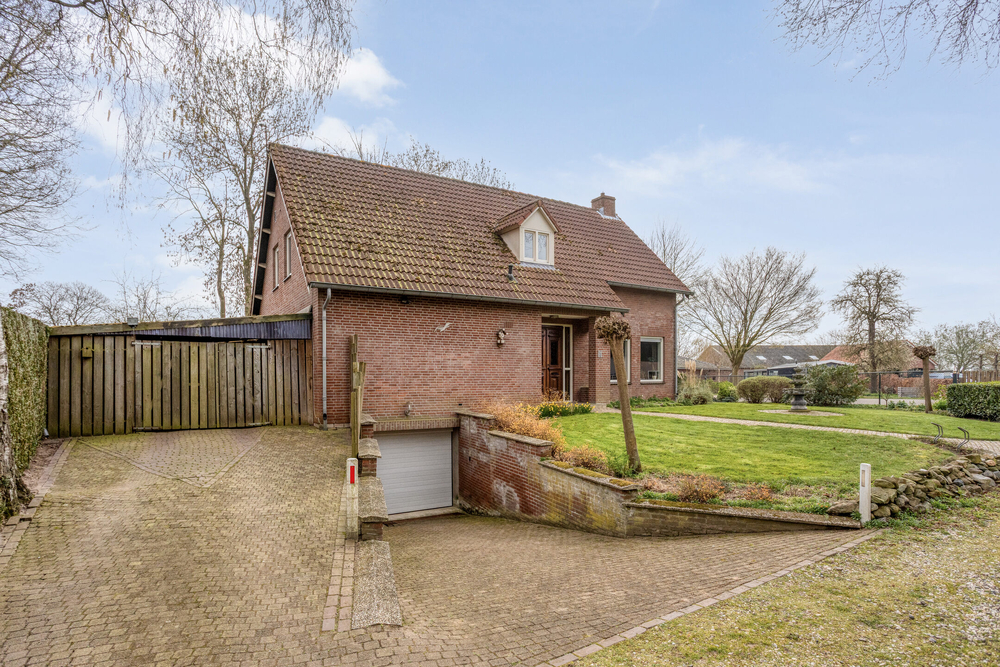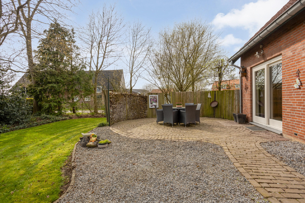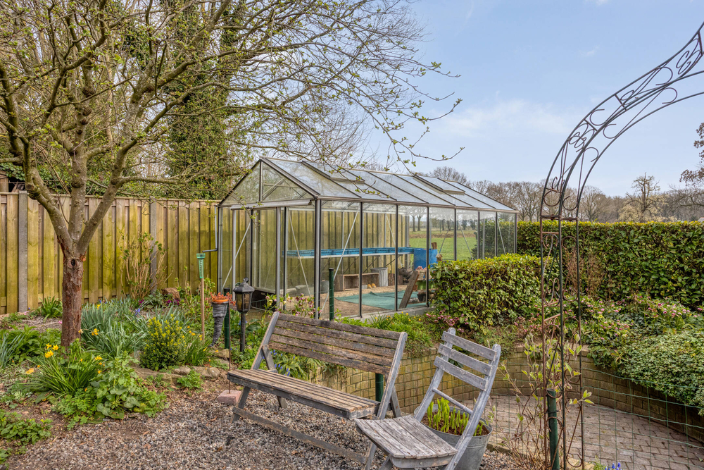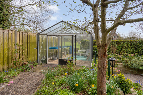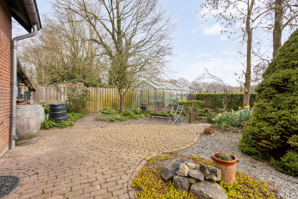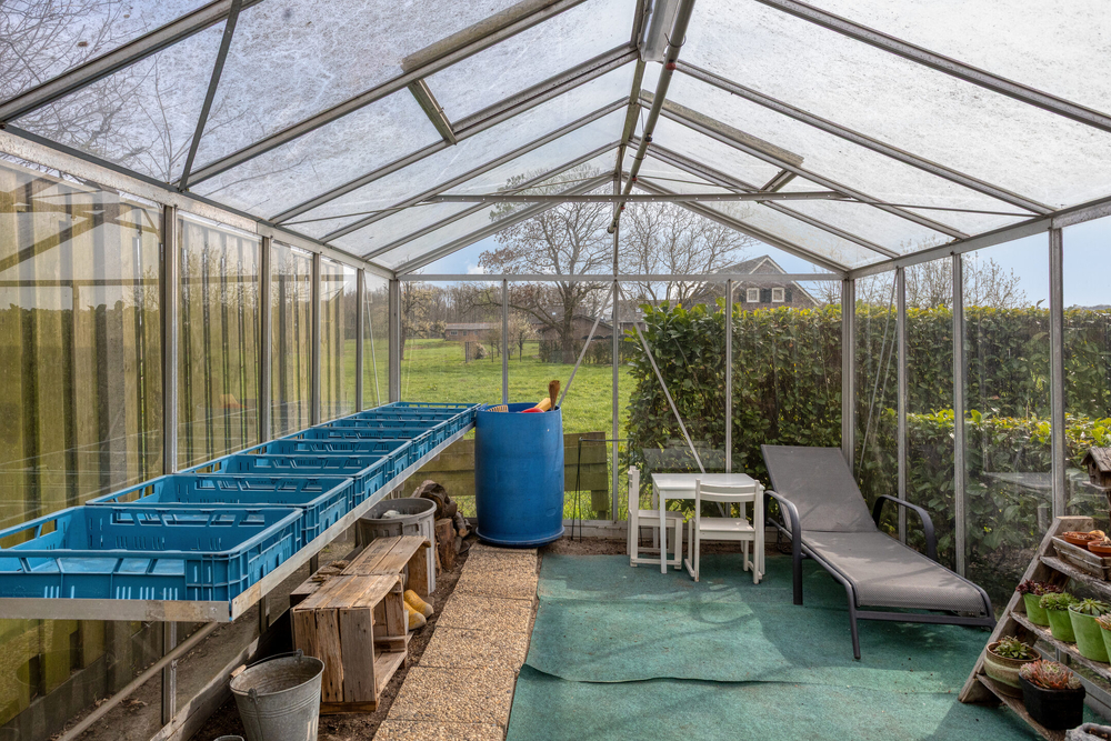 De fraai aangelegde tuin rondom de woning biedt volop privacy en diverse zitplekken. Er zijn meerdere terrassen aanwezig, een kas en een sproei-installatie met grondwaterpomp. Daarnaast beschikt de woning over een carport en extra bergruimte naast de woning. Vanuit de tuin geniet je van een prachtig vrij uitzicht over de omliggende weilanden.
