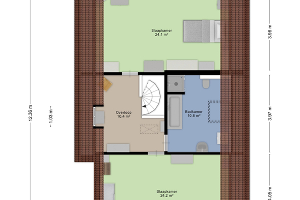 Overloop met toegang tot twee zeer ruime slaapkamers. Door het formaat van de kamers is het mogelijk om extra slaapkamers te realiseren. De tweede badkamer is voorzien van een ligbad, douche, toilet, wastafel en wasmachineaansluiting.