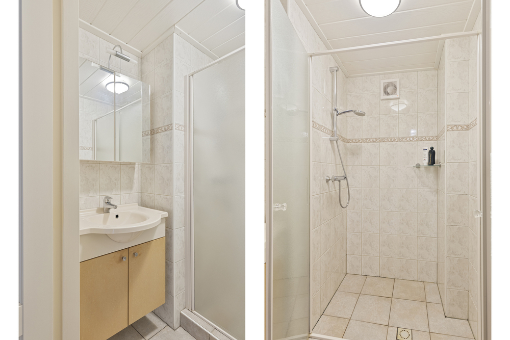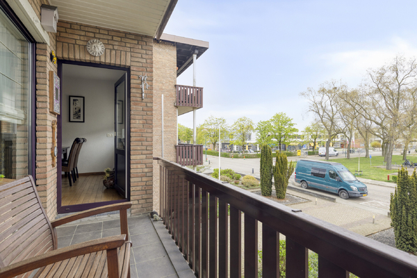 Appartement: Entree met hal en toegang tot de verschillende vertrekken. De ruime woonkamer biedt veel lichtinval en staat in verbinding met het balkon aan de voorzijde. De keuken is functioneel en netjes, met toegang tot het tweede balkon aan de achterzijde. Aan de achterzijde is tevens de slaapkamer. De badkamer is voorzien van douche en wastafel. Separaat toilet aanwezig. Daarnaast is er een praktische inpandige berging/bijkeuken voor extra opslag en witgoedaansluitingen.